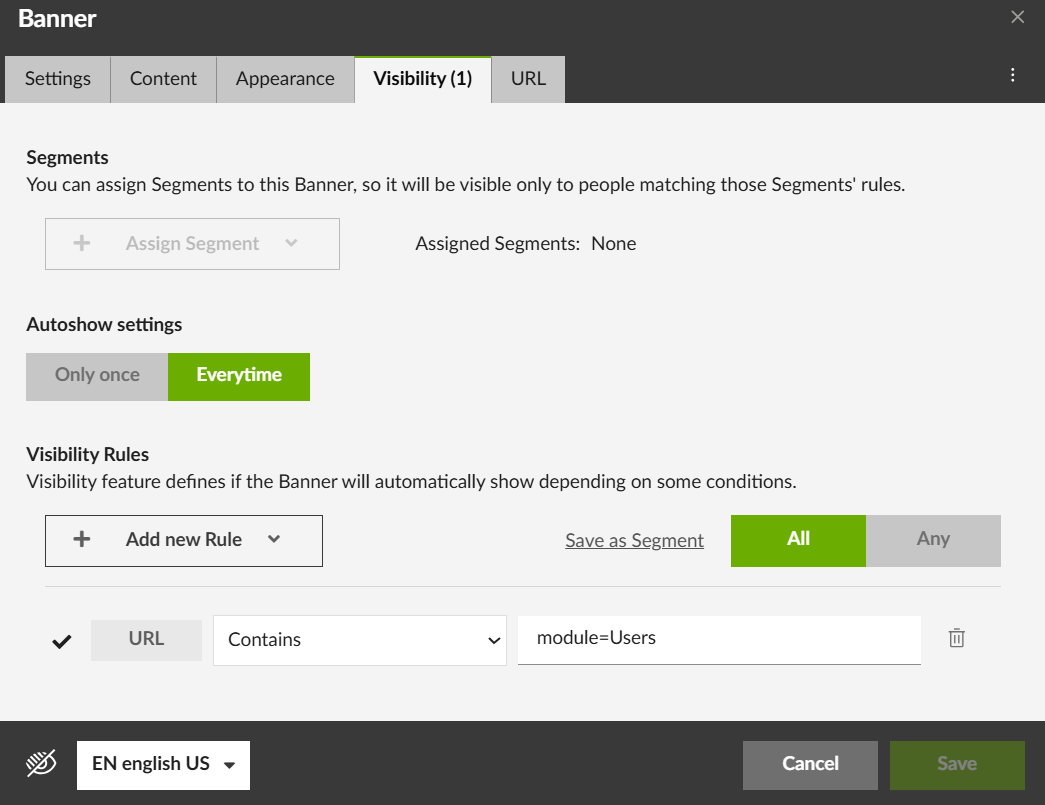 Banners are shown automatically to users based on the specified visibility conditions. Users can dismiss the Banner and it will be displayed again when the conditions for displaying are met. If users check the "Don't show again" checkbox, the Banner will not be displayed again although the visibility conditions are matched.