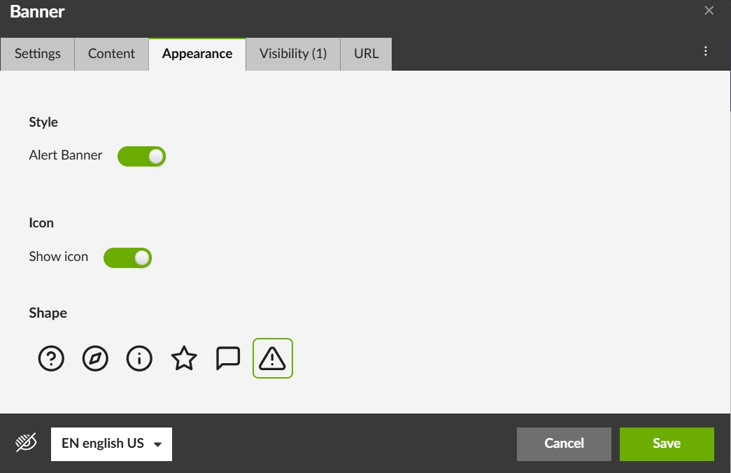 Optionally, in the Appearance tab the content authors can enable the icon to be part of the Banner title and/or the Alert design of the Banner: